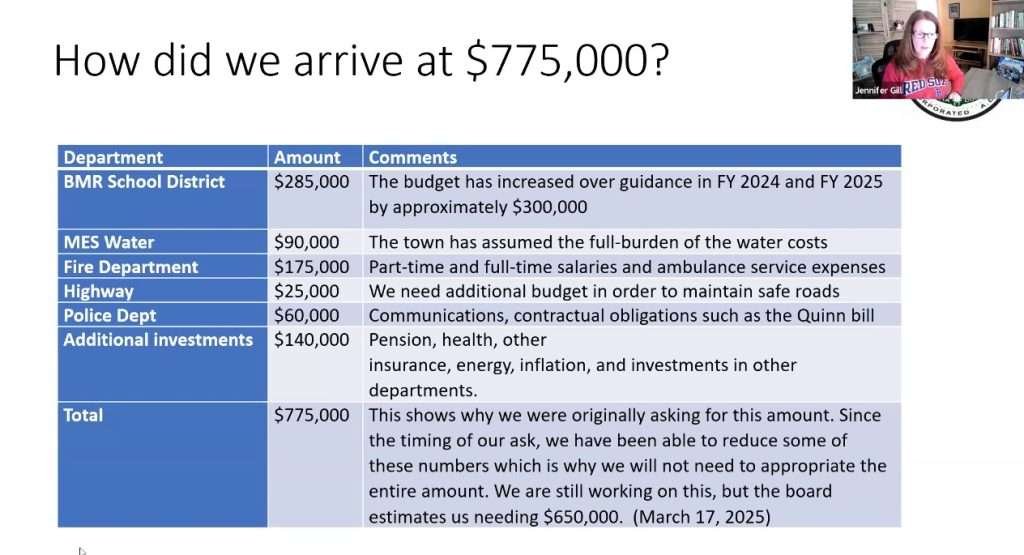 - The requested override is $775,000, with town officials working to reduce that number, estimating the amount needed is around 650,000 dollars.